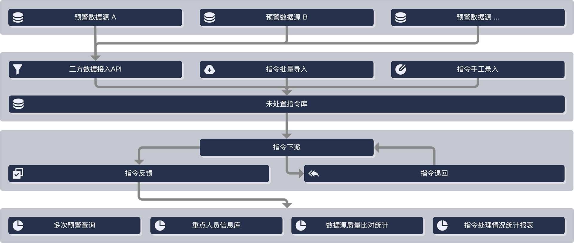 指令导入、下派、反馈、退回、转派,针对各种预警场景,进行全面的流程与逻辑优化,提升预警服务的执行效率。